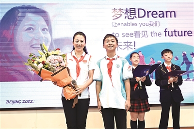 中国冬奥首金获得者杨扬(左)参加校园活动。