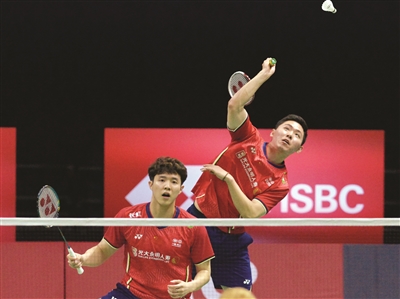 中国队组合何济霆/周昊东(右)在汤杯男双比赛中。 新华社发 (拉亨摄)