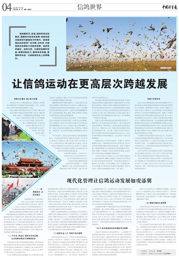 中国信鸽协会会长邢小泉介绍说,中国信鸽事业的长足发展使中国信鸽在国际上的影响力日益增强,经外交部批准,1997年1月,在瑞士巴塞尔召开的第25届国际鸽联奥林匹克大会上,中国正式加入国际鸽联,从那一刻起,中国信鸽以崭新姿态走上世界舞台,不断创新、不断进步,成为世界信鸽运动发展最强有力的引擎。