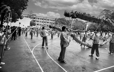 在学校大课间时间,不同场地会进行舞龙、舞狮、九子鞭、蚌壳舞、地花鼓、锣鼓队的分组训练,在重要表演前会六组合训,展示团体的活动效能,大大加强学生的学习训练兴趣。“学生现在练习得好,演出的机会也多,很多时候会到城里演出。孩子们的表现从一开始的紧张无措,到现在的从容大方,让我看到他们对自己更加自信了,性格也逐渐变得开朗。”胡昌军说,很多家长特意给学校打电话,说孩子舞狮舞得很好,感觉十分骄傲。