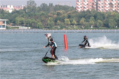 2024年全国电动冲浪板锦标赛于10月14日至17日在浙江省金华市湖海塘公园举办。图为运动员在湖面上角逐。
