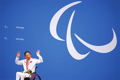 8月25日,在东京残奥会游泳女子200米自由泳S5级决赛中,中国选手张丽以2分46秒53的成绩获得金牌。图为张丽在颁奖仪式上。