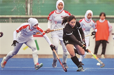 4月25日,在江苏省常州市举行的“两湖创新杯”首届女子曲棍球国际邀请赛半决赛中,江苏省女子曲棍球队以4比0战胜马来西亚女子国家队,晋级决赛。图为江苏队球员王严(前右)带球突破。