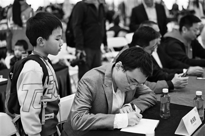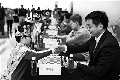 ⑤许翔宇(右一)与参加擂台赛的小棋手握手。