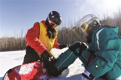 41岁的王芳在黑龙江亚布力滑雪旅游度假区做滑雪教练已有十几年,每个雪季,在各条雪道都能看到她的身影。背靠家门口的“雪山”,王芳成就了自己的热爱与责任。图为王芳(左)为江苏常州的游客固定雪具。
