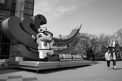 为迎接2025年第九届亚冬会的到来,营造喜迎亚冬会的浓厚氛围,亚冬会执委会在哈尔滨市重要交通枢纽、景区景点、地标建筑等位置设置十处景观雕塑及2个可移动式景观雕塑。图为4月10日,游客经过哈尔滨市防洪纪念塔附近一处正在搭建的亚冬会主题景观雕塑。