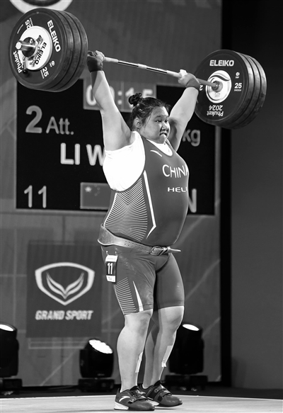 ②侯志慧在女子49公斤级比赛中打破抓举世界纪录。