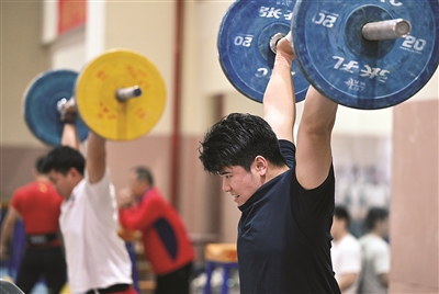 12月25日,湖南、湖北、天津、河北等地举重队在海南省五指山市进行冬训,备战第十五届全国运动会。图为天津市举重队运动员刘焕华在训练中。 新华社记者 郭程摄