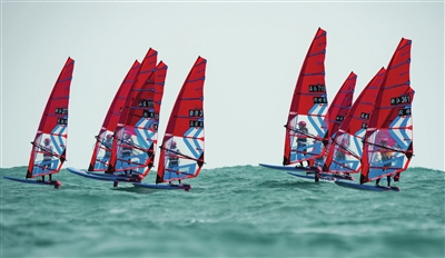 10月27日,第十五届全运会帆船项目第二阶段比赛在广东省汕尾市继续举行。图为参赛选手在女子水翼帆板级第二阶段比赛中。 新华社记者 晋美多吉摄