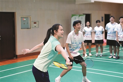 冠军体育课在羽毛球馆展开。“郑老师好!”随着校羽毛球队队员们的问候,郑雨带领大家热身,随后拿起球拍作示范,“不要害怕失误,把动作做完整。”简单讲解后,郑雨与高二学生刘思辰搭档,进行了混双表演赛。“郑老师的出球更隐蔽,发力更集中,还有很多细节值得我学习。”刘思辰为郑雨竖起了大拇指。高一年级学生刘浩然认为,与郑雨同台打球让他受益良多:“打球要多动脑,打完一个球要想对方会怎样回,就像郑雨老师那样,预判对方的球路,这样才能更好地抓住机会。”谈及与郑雨进行混双对决的感悟,刘浩然坚定地说:“球不落地,永不放弃。”