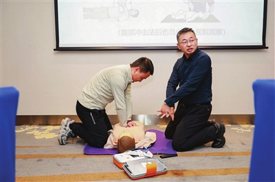 在心肺复苏急救培训课上,人力资源和社会保障部应急救援宣讲师刘屹讲解了心肺复苏法以及正确使用AED的方法,并指导多位学员在人体模型上现场进行演练。