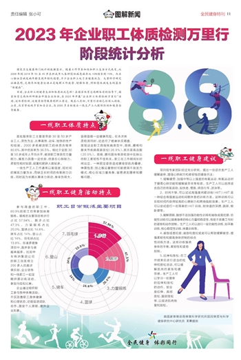 目前,企业职工的健身生活和体质状况怎样?在国家体育总局群体司的指导下,国家体育总局体科所联合中国企业体协,在2023年开展“企业职工体质检测万里行”活动,送体质检测、送健身指导服务到职工身边。截至八月初,万里行活动已经深入湖南、山东、北京等地的多家知名企业,为2000多名制造业一线生产工人提供检测和健身指导服务。