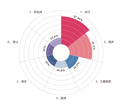 参与调查的职工中,60.9%的职工日常参加体育锻炼。锻炼的主要项目有步行占比57.94%、跑步占比47.3%、力量锻炼占比20.0%、篮球占比14.8%、骑车占比14%、登山占比14%、羽毛球占比13.8%。在诸多健身项目中,跑步参与者越来越多。比如中车株洲集团公司的职工自发成立200多人的跑步俱乐部,企业领导和一线职工一起定期开展训练活动,参加马拉松比赛。