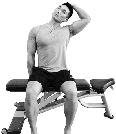 以牵拉右侧为例,坐位,右手压在臀部下方,左手食指和中指做剪刀手状,轻轻放在右侧耳朵尖部的两旁。左手辅助头部向左侧侧屈,当右侧肩部有轻微针刺感时停止运动,动作维持30至60秒,左右两侧各重复3至5次。