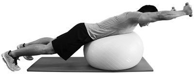 俯卧,胸部压在瑞士球上或直接俯卧于地面,双脚分开与肩同宽支撑于地面,双手持小哑铃上举。肘关节保持微屈,大拇指向上保持双臂与双耳处于同一水平面上。保持正常呼吸同时挺起背部,保持身体平衡。每组重复10至15次,共练习3组。在练习时不能耸肩,要不断提醒自己肩关节向下沉。