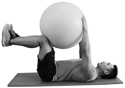 仰卧于瑜伽垫上,双手和双膝固定住一个瑞士球,进行腹式呼吸。手交替离开球举过头顶,保持1分钟,重复3至5次。在做这个练习时,要保持腹式呼吸,尽量将腰部压在地面上,腰部不能过度离开地面。