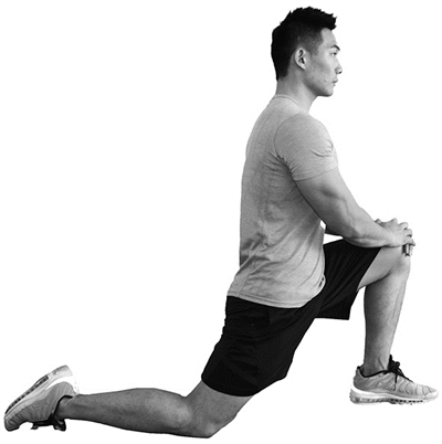 弓箭步,后腿膝盖贴在瑜伽垫上,骨盆后倾,注意力集中在髋部前方的屈髋肌群上,感受屈髋肌群的牵拉感,保持30至60秒,重复3至5次。