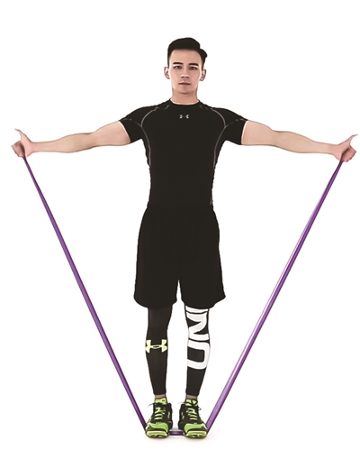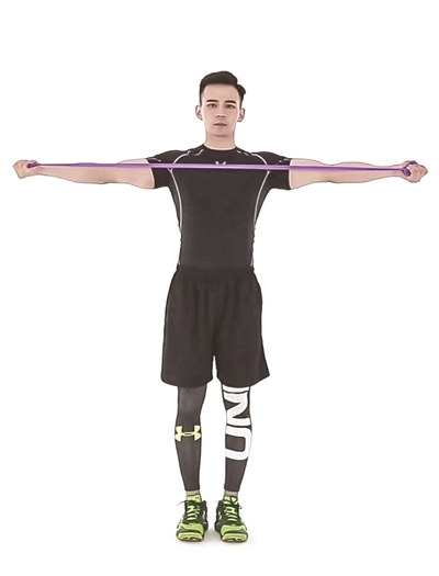 动作要领:站姿,双脚开立与肩同宽,腰背挺直,双臂自然下垂。双臂伸直,外展至与地面平行,掌心朝前;然后双臂水平后展至最大幅度,使胸部有拉伸感最后回到起始姿势。重复以上步骤至规定次数。全程保持腰背挺直。