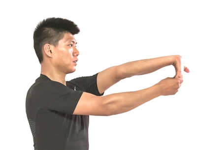 动作要领:双脚平行站立,与肩同宽,脚尖朝前。双腿伸直,臀部收紧,挺胸抬头,目视前方,下颌收紧,双臂自然下垂。双手十指交叉,双臂同时内旋,并伸至身体的最前方,手臂垂直于躯干,掌心向外。手臂用力向正前方伸,两肩同时向前,肩胛骨前伸,保持该姿势至规定时间。重复以上步骤至规定次数。保持核心收紧,腰背挺直整个动作过程中躯干保持稳定、手臂伸直,向前伸展至最大幅度。