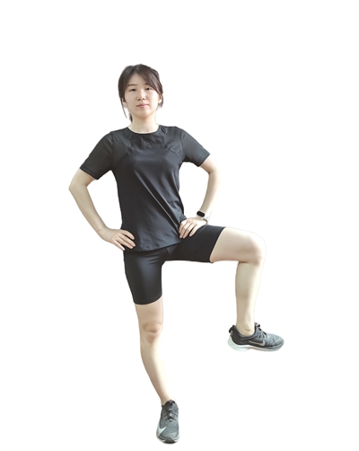 动作要领:站姿,双脚开立与肩同宽,腰背挺直,双手叉腰。身体重心移到一侧腿上,对侧腿的大腿后侧肌群发力,小腿向后勾,尽力去触碰大腿。换至对侧,重复以上步骤至规定次数。全程保持核心收紧,腰背挺直,注意保持平衡。