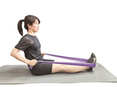 动作要领:坐于垫上,双腿伸直,双脚并拢平放在垫子上脚底面与地面垂直。背部挺直,双臂于肘关节处弯曲约90度,双手握弹力带,拳心相对。上背肌发力带动上臀向后移动,同时将两侧肩脾骨向中间挤压,做划船动作,然后回到起始姿势。重复以上步骤至规定次数。