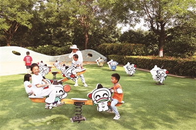 走进郑州中国体育彩票健康主题公园,可以看到很多群众在遛弯跑步,还有许多老人利用步道旁的健身器材“活动筋骨”。儿童乐园吸引很多家长带着孩子前来玩耍,这里根据不同年龄段的游玩特点分为幼儿玩乐区和大童游乐区,其中大童游乐区以高8米的集装箱滑梯攀爬组合设备为主,远处一看,两只萌萌的乐小星坐在集装箱上,憨态可掬。